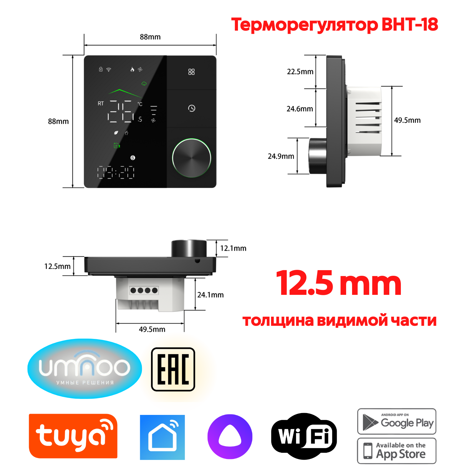 Модель: термостат для водяного пола umnoo серия 18, черного цвета, на 3А, с модулем Wi‑Fi.